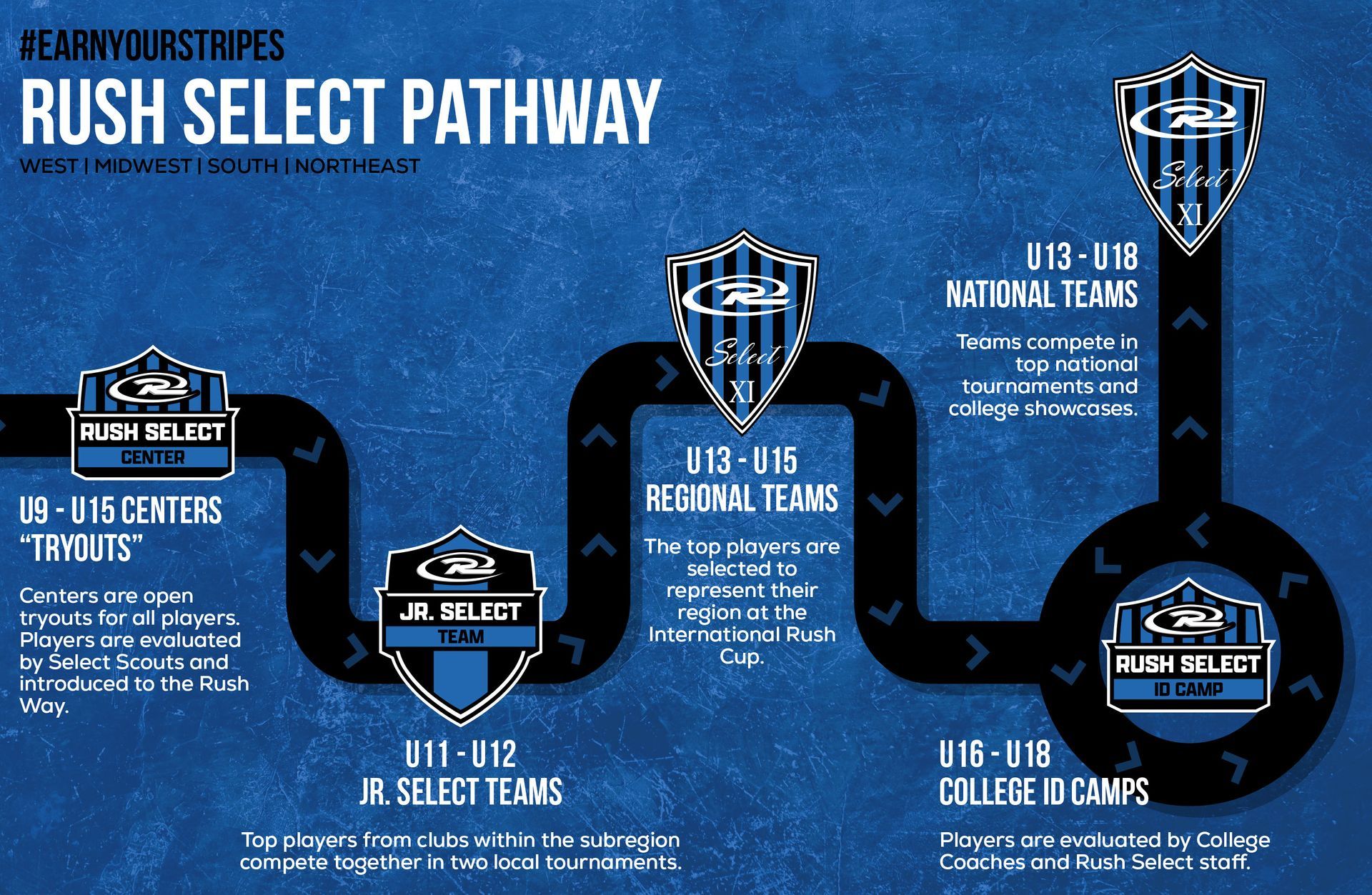 Our older players, U16-U18 can be recruited through our Regional ID Camps, which also serve as a college recruitment opportunity. The process is simple, consistent, and designed to give every Rush player a genuine opportunity.